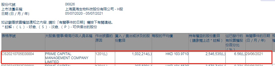 智通财经APP获悉,香港联交所最新资料显示,6月29日,PRIME CAPITAL Mgt减持昊海生物科技(06826)约103.22万股,每股作价103.971港元,总金额约为1.07亿港元。减持后最新持股数目约为254.65万股,最新持股比例为6.56%。