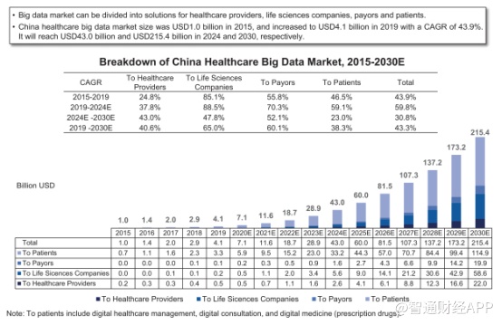 以肿瘤大数据市场为例,近年来,中国肿瘤大数据市场规模同样发展迅速,从2015年的5亿美元增长到2年的21亿美元,复合年均增长率为46.1%,预计到2030年将增长到1196亿美元,2019-2030年的年均复合增长率为44.4%。