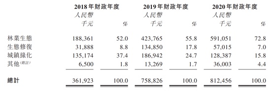 从收入结构上来看,林业生态是公司营收的顶梁柱,由2018财年的1.88亿元迅猛增长至2020财年的约5.91亿元,占总营收的比例也油往年的52%提升至72.8%。对总营收做出第二大贡献的则为城镇绿化业务,但其近三年收入略有波动,维持在1.3-1.8亿元区间不等,占总营收比例却在逐年下降。