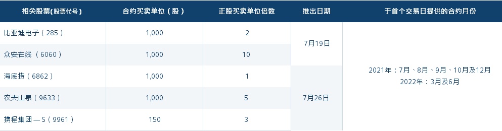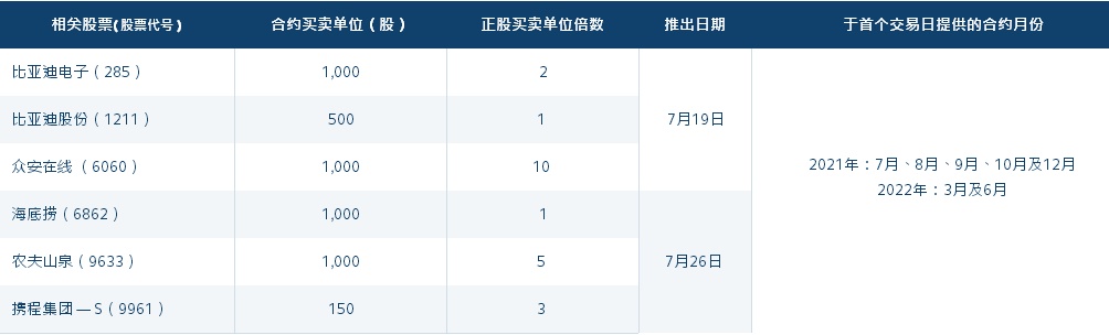智通财经APP获悉,7月6日,香港交易及结算所有限公司(香港交易所)宣布,将分别于7月19日及7月26日分批推出六只新的股票期货合约及五只新的股票期权类别。