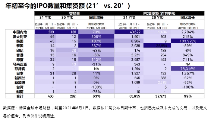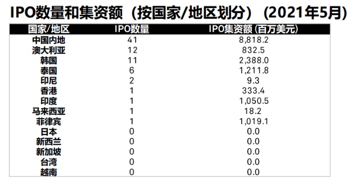 智通财经APP获悉,根据标普全球发布的最新数据显示,中国内地在亚太地区的IPO排名第一,新增41宗IPO,集资额90亿美元。2021年初至今,泰国的IPO数量同比增幅最大(367%)。韩国的IPO集资额飙升,同比增长103923%,菲律宾紧随其后,为78316%。