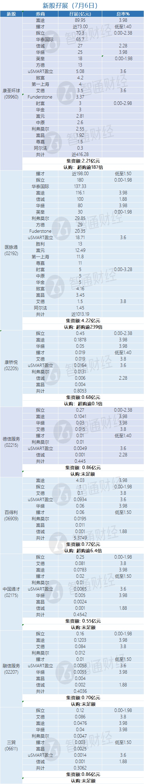 智通财经APP获悉,康圣环球(09960)、医脉通(02192)、康桥悦(02205)、德信服务(02215)、百得利(06909)、中国通才(02175)、融信服务(02207)、三巽集团(06611)正在招股中。截至7月6日,富途、辉立、耀才等合计分别为其借出近416.28亿港元、近1013.19亿港元、0.8053亿港元、0.445亿港元、5.3749亿港元、0.4542亿港元、0.4036亿港元、0.3062亿港元。其中,康圣环球超购逾187倍,医脉通超购逾239倍,康桥悦超购逾0.1倍,百得利超购逾6.4倍。