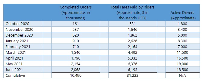 据悉,森淼科技网约车平台推出以来,已完成超过1050万个订单,其中包括2021年6月期间约210万个的订单。截至2021年6月30日的6个月里,完成订单数量和活跃司机数量平均月增长率分别约为29%和28%。