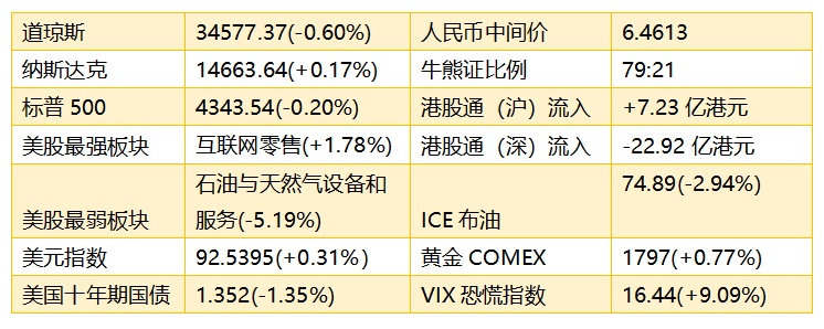 1、隔夜美股截至收盘,纳斯达克综合指数涨24.32点,涨幅0.17%,报14663.64点;道琼斯指数跌208.98点,跌幅0.6%,报34577.37点;标普500指数跌8.8点,跌幅0.2%,报4343.54点。港股ADR指数下跌,按比例计算,收报27688点,跌383.69点或1.39%。