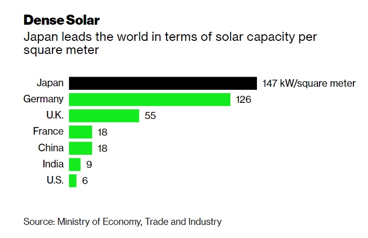 以每平方公里的太阳能发电量计算,日本已经处于世界领先地位,目前日本需要大量增加分布式太阳能发电,即建筑物或农场顶部的小型太阳能电池板。