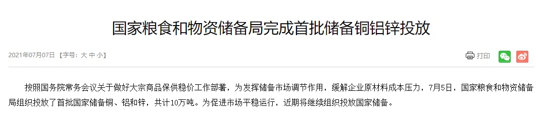 智通财经APP获悉,据国家粮食和物资储备局官网披露,按照国务院常务会议关于做好大宗商品保供稳价工作部署,为发挥储备市场调节作用,缓解企业原材料成本压力,7月5日,国家粮食和物资储备局组织投放了首批国家储备铜、铝和锌,共计10万吨。为促进市场平稳运行,近期将继续组织投放国家储备。