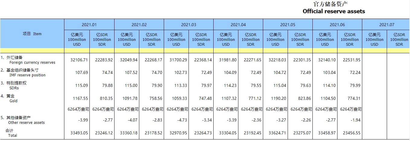 智通财经APP获悉,据中国人民银行统计数据,6月中国外汇储备32140.1亿美元,前值32218.03亿美元;官方储备资产合计33458.97亿美元,前值33624.71亿美元。中国6月末黄金储备报6264万盎司(约1948.32吨),与上个月持平。