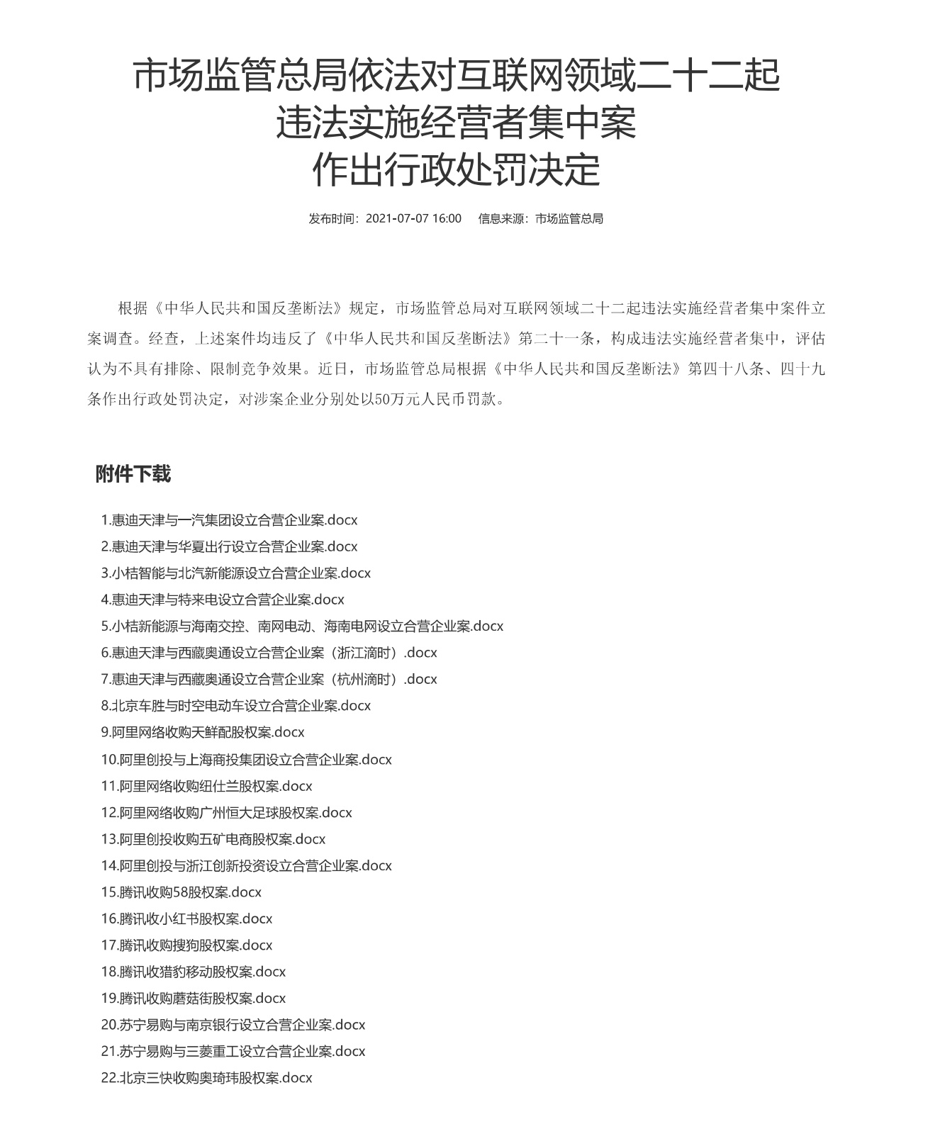 智通财经APP获悉,市场监管总局对互联网领域二十二起违法实施经营者集中案作出行政处罚决定。经查,相关案件均违反了《中华人民共和国反垄断法》,构成违法实施经营者集中。因此,市场监管总局作出行政处罚决定,对涉案企业分别处以50万元人民币罚款。涉事企业包括阿里和腾讯等企业。涉及的案件如下: