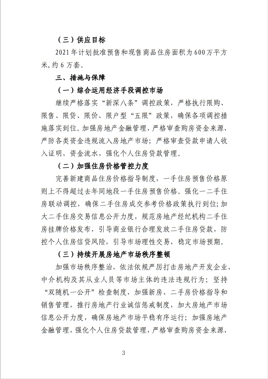 智通财经APP获悉,7月7日,深圳市住房和建设局发布关于印发《深圳市住房发展2021年度实施计划》的通知。《实施计划》提出,2021年,计划供应商品住房用地149.3公顷,其中新供应用地58.3公顷,更新整备用地91公顷;计划新开工商品住房建筑面积700万平方米,约7万套;计划批准预售和现售商品住房面积为600万平方米,约6万套。