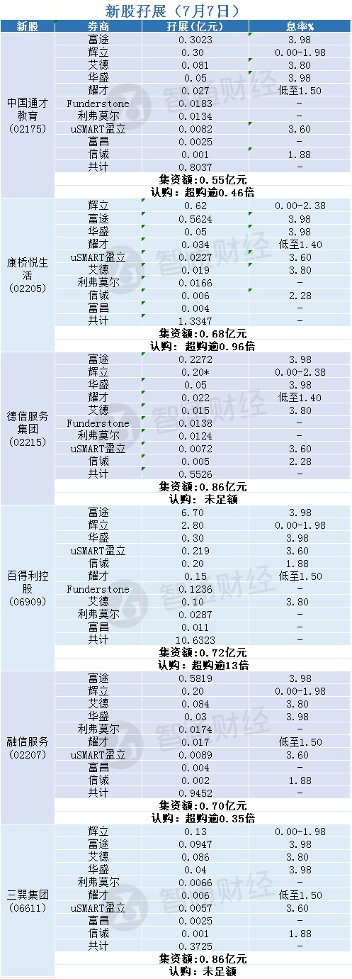 智通财经APP获悉,中国通才教育(02175)、康桥悦生活(02205)、德信服务(02215)、百得利控股(06909)、融信服务(02207)、三巽集团(06611)正在招股中。截至7月7日,富途、辉立、耀才等合计分别为其借出0.8037亿港元、1.3347亿港元、0.5526亿港元、10.6323亿港元、0.9452亿港元、0.3725亿港元。其中,中国通才教育、康桥悦生活、百得利、融信服务分别超购逾0.46倍、0.96倍、13倍、0.35倍。