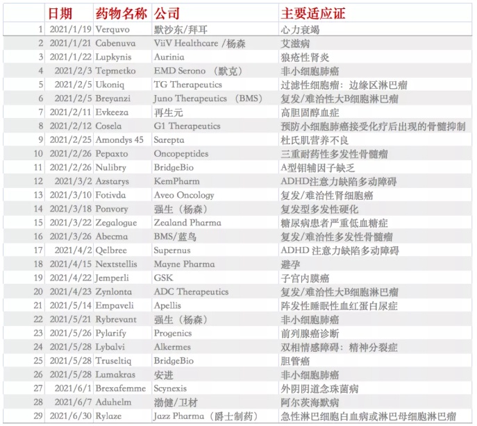 在上半年获批的29款药物中,肿瘤药仍是主流,占据批准药物的44%,这一比例也已超出2020全年。2020年,获批上市的53款药物中有20种为肿瘤药物。