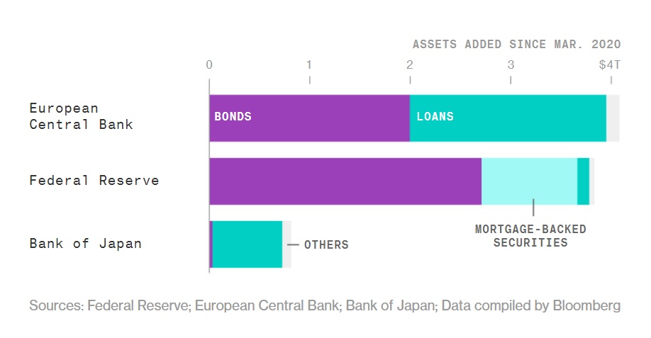 央行的钱都到哪里去了?——购买了大量债券,帮助本国政府为刺激计划提供资金。