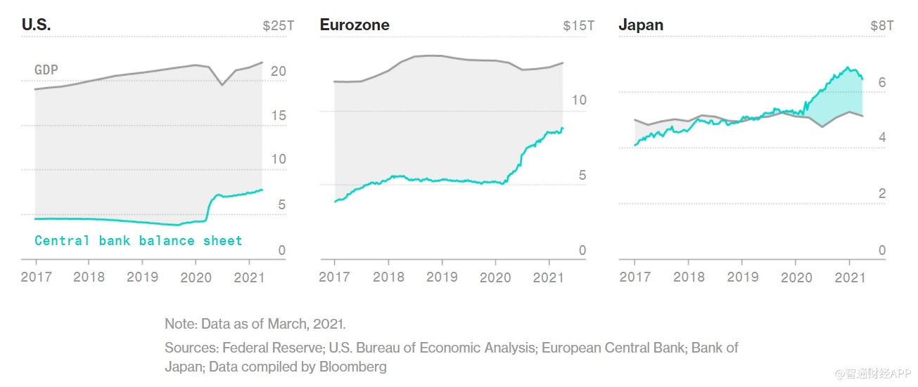 自从新冠疫情爆发以来,美国、欧洲和日本的央行的支出规模已经达到了9万亿美元。