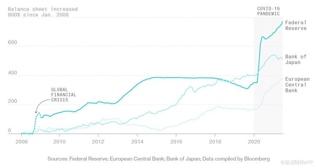 这种空前规模的QE将美联储、欧洲央行和日本央行的总资产增至24万亿美元。现在,全球关注点都转向主要央行何时放松大规模货币刺激计划,以及由此主要经济体将面临的挑战。