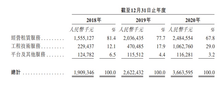 于往绩记录期间,公司的大部份收入来自经营租赁服务。近三年来,该项服务产生的收入分别为15.55亿元、20.36亿元、24.85亿元,分别占相应年度收入的81.4%、77.7%及67.8%。来自工程技术服务及平台及其他服务的收入合并占总收入的百分比由2018年的18.6%增至2020年的32.2%。