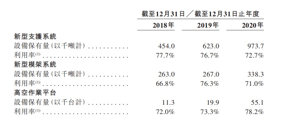 具体而言,公司在新型支护系统、新型模架系统及高空作业平台三个设备运营服务市场均独占鳌头。