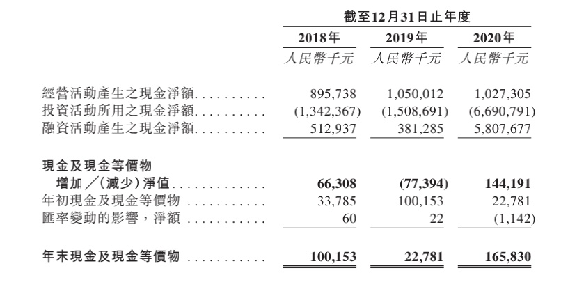 目前公司主要资金来源包括业务运营所得现金及借款。2018年至2020年,公司经营活动产生的现金流分别为8.96亿元、10.50亿元、10.27亿元,逐年递增。