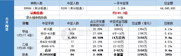 其中,公开配售申购人数59586人,一手中签率3.26%,认购倍数约145.3倍。