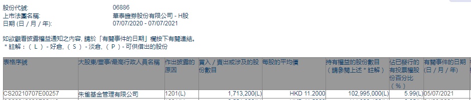 智通财经APP获悉,香港联交所最新资料显示,7月5日,朱雀基金管理有限公司减持华泰证券(06886)171.32万股,每股作价11.2港元,总金额约为1918.78万港元。减持后最新持股数目约为1.03亿股,最新持股比例为5.99%。