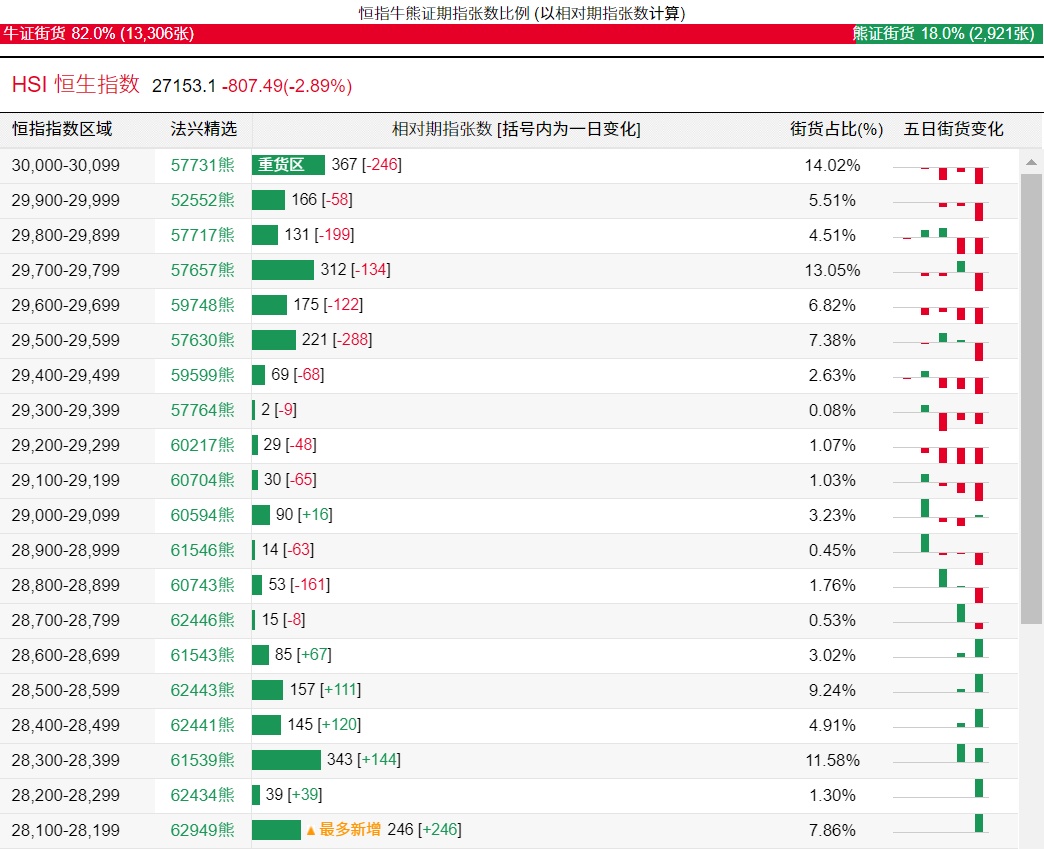 法兴恒指牛熊证街货分布图中的数据显示,熊证街货重货区在30000-30099区间,该区间最新熊证数量为367张,较上一交易日减少246张;最多新增在28100-28199区间,该区间最新熊证数量为246张,较上一交易日增加246张。