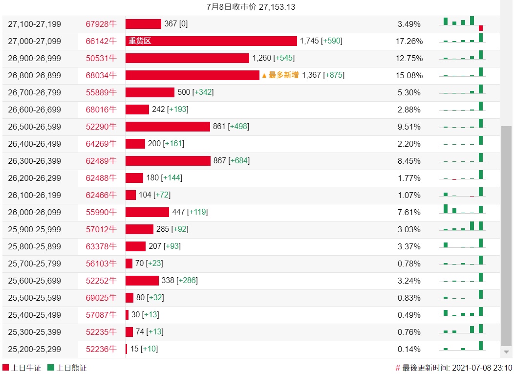 牛证街货重货区在27000-27099区间,该区间最新牛证数量为1745张,较上一交易日增加590张;最多新增在26800-26899区间,该区间最新牛证数量为1367张,较上一交易日增加875张。