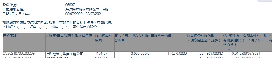 智通财经APP获悉,联交所最新资料显示,7月8日,上海电气(集团)总公司增持海通证券(06837)300万股,每股作价6.60港元,总金额约为1980万港元。增持后最新持股数目约为2.05亿股,最新持股比例为6.01%。