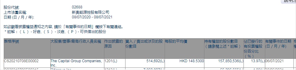 智通财经APP获悉,香港联交所最新资料显示,7月6日,The Capital Group Companies减持新奥能源(02688)约51.47万股,每股作价148.53港元,总金额约为7644.72万港元。减持后最新持股数目约为1.58亿股,最新持股比例为13.97%。