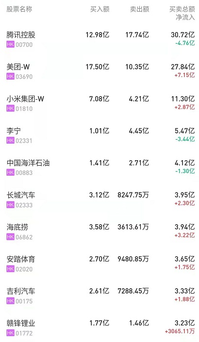 此外,海底捞(06862)、赣锋锂业(01772)分别获净买入3.21亿、3065万港元。而中海油(00883)遭净卖出1.68亿港元。