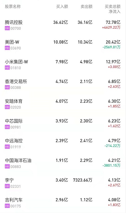 港股通(深)十大活跃成交股