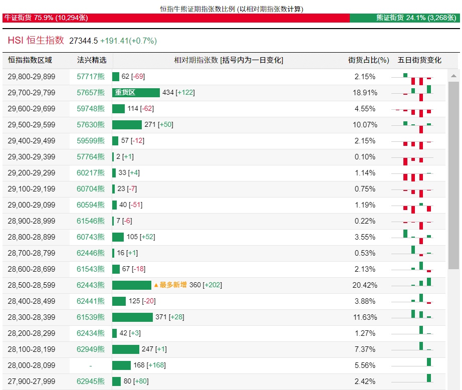 法兴恒指牛熊证街货分布图中的数据显示,熊证街货重货区在29700-29799区间,该区间最新熊证数量为434张,较上一交易日增加122张;最多新增在28500-28599区间,该区间最新熊证数量为360张,较上一交易日增加202张。