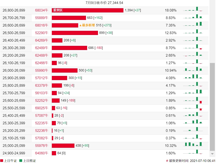 牛证街货重货区在26800-26899区间,该区间最新牛证数量为1394张,较上一交易日增加27张;最多新增在26600-26699区间,该区间最新牛证数量为515张,较上一交易日增加273张。