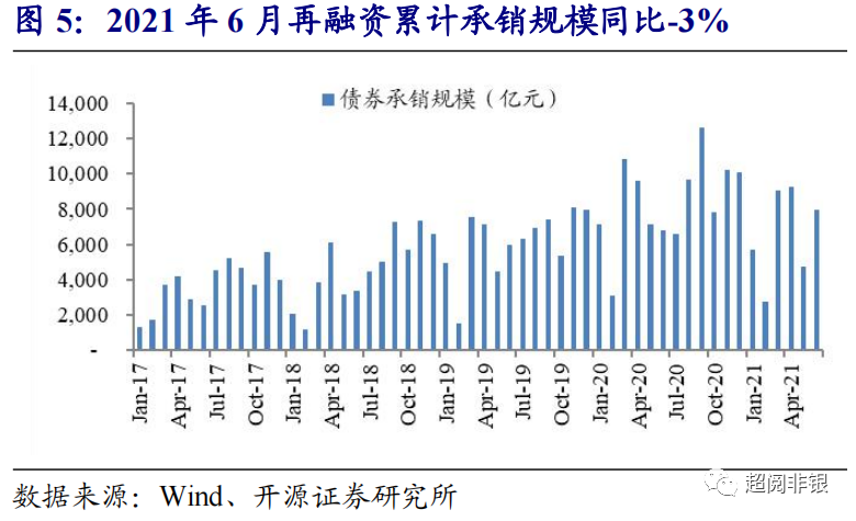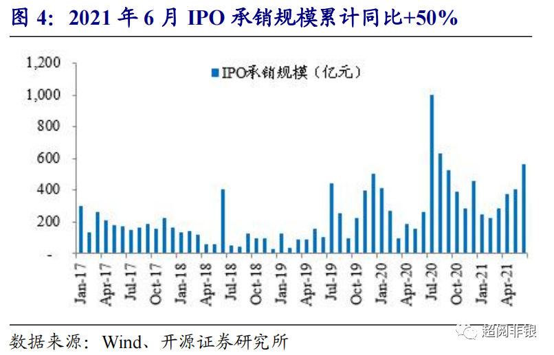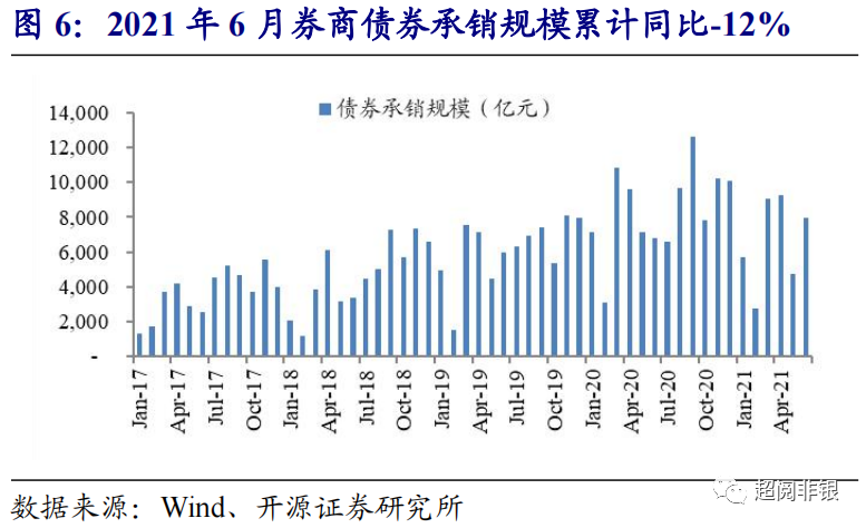 券商投行业务:截至7月9日,2021年IPO/再融资/债券承销规模分别为2202亿元/ 4026亿元/ 51406亿元,同比+52.0%/-0.7%/+14.0%,IPO和债券承销规模同比扩张。