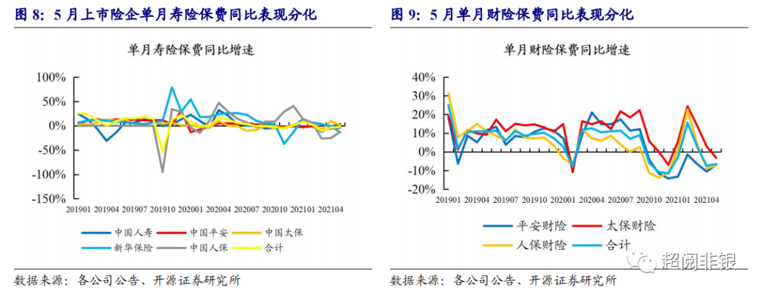 财险保费月度数据:5 月 3 家上市险企财险保费收入同比为-6.5%,较 4 月的-7.4% 回升 0.9pct,主要原因为车险综改压力及 2020 年同期高基数。其中:太保财险-3.2%、 平安财险-6.9%、人保财险-7.4%。