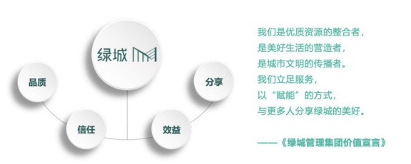 据了解,绿城管理新一代的集团价值宣言,是在原先绿城集团“品质、信任、效益、分享”的价值观设定上,进行了升级和细化,明确了企业的深层价值逻辑,即以“优质资源整合者、美好生活营造者、城市文明传播者”的企业定位,立足服务,以“赋能”方式,与更多人分享绿城美好。