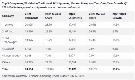 2021年7月12日,知名数据研究机构IDC公布了2021年第二季度全球PC市场表现报告。报告显示,尽管PC供应链中依然存在部件缺货等问题,全球PC市场需求的激增依然持续到了这个季度。2021年第二季度,全球PC出货量达到8360万台,同比去年同期增长13.2%。与此同时,笔记本电脑持续增加的需求本季度分流到了台式电脑,本季度台式电脑增长幅度超过了笔记本。