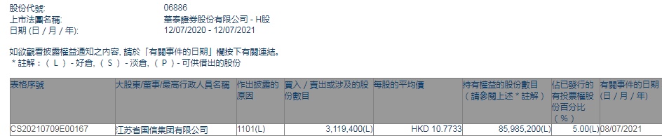 智通财经APP获悉,香港联交所最新资料显示,7月8日,江苏省国信集团增持华泰证券(06886)311.94万股,每股作价10.7733港元,总金额约为3360.62万港元。增持后最新持股数目约为8598.52万股,最新持股比例为5%。