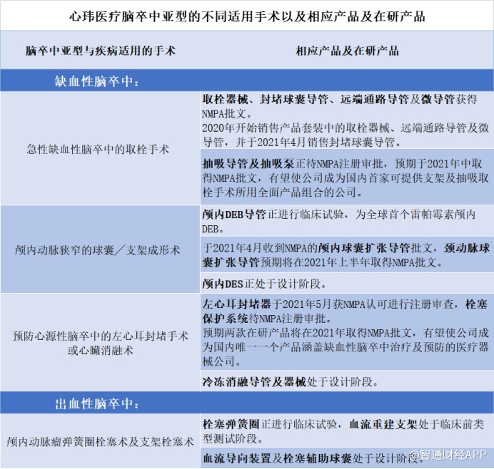 从取栓支架逐步向脑卒中预防到治疗各个环节渗透,公司在研产品组合现已涵盖缺血性脑卒中取栓术、颅内狭窄治疗、缺血性脑卒中预防及出血性脑卒中治疗等领域,覆盖了神经介入领域的所有主要脑卒中亚型及手术路径,也使其成为唯一拥有覆盖脑卒中预防到治疗的一站式产品管线的市场参与者。