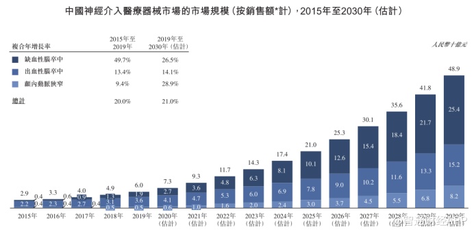 2015-2019年,我国神经介入医疗器械市场规模由29亿元增至60亿元人民币,复合年增长率达20.0%。据灼识咨询预计,2019-2030年,市场规模将进一步以21.0%的复合年增长率增长,并将于2030年进一步增加至人民币489亿元,可达近五百亿行业规模,具备庞大市场需求。