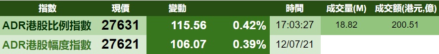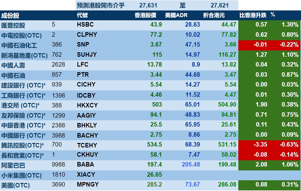 智通财经APP获悉,周五美股三大指数齐涨,港股ADR指数上扬,按比例计算,收报27631点,上涨115.56点或0.42%。