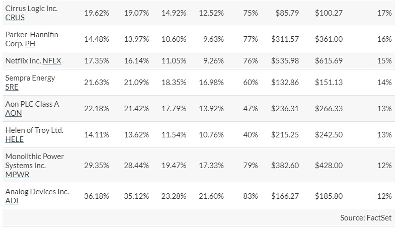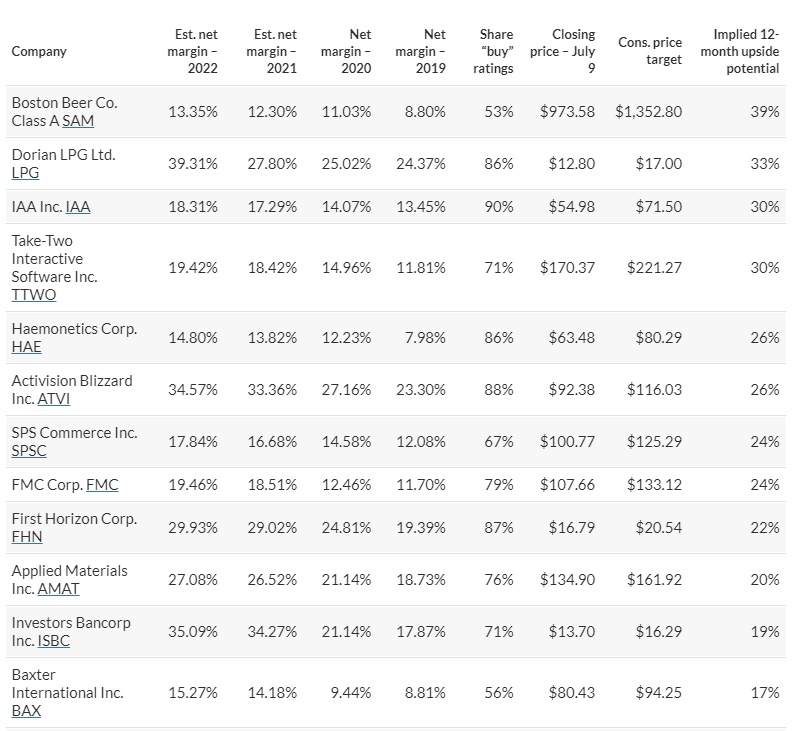 以Kostin为首的高盛个分析师团队对标准普尔500指数中“净利率高于平均水平,2020年实现净利率增长50+基点,未来两年预计每年净利率增长50+基点”的股票进行了筛选。
