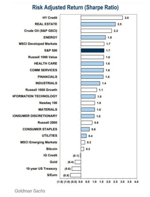 根据高盛的一份按资产类别划分的风险调整资产回报率图表可以看到,比特币当前已接近底部。