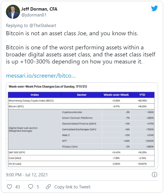 当然, 部分人认为比特币不是一种资产类别,而应该将这种资产类别定性为“加密货币”。而在这种情况下,比特币则成为了今年表现最差的加密货币之一。