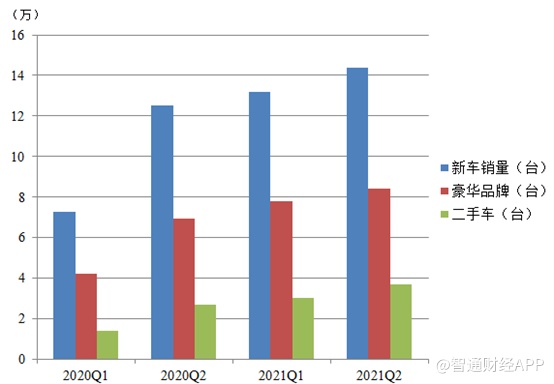 分季度看,2021Q2新车销量143650辆,同比增长15%,豪华品牌销量83985辆,同比增长21%,同样可以看到豪华品牌的销售增速高于整体销售。2016年至2020年,中升的豪华车销售占比从不足40%提升至近60%,增长了20个百分点。
