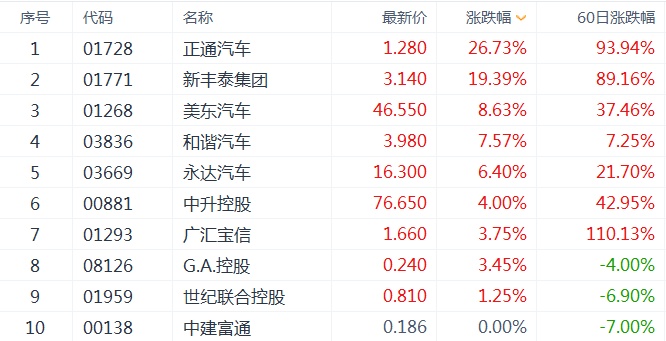截止收盘,板块上,港股汽车经销商板块、汽车零售商板块分别大涨5.73%、5.61%,涨幅靠前。个股方面,正通汽车(01728)飙涨26.73%,新丰泰集团(01771)大涨近20%,美东汽车(01268)上涨逾8%,和谐汽车、永达汽车、广汇宝信等汽车股皆大幅跟涨。