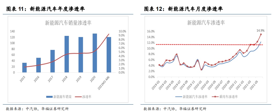 整体来看,2021年1-6月,新能源汽车产销分别完成121.5万辆和120.6万辆,同比均增长2倍,目前新能源汽车累计销量已与2019年全年水平持平。渗透率则为120.6万辆,渗透率9.4%,较2020年增加4.2个百分点。