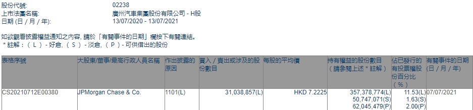 智通财经APP获悉,香港联交所最新资料显示,7月7日,小摩增持广汽集团(02238)3103.89万股,每股作价7.22港元,总金额约为2.24亿港元。增持后最新持股数目约为3.57亿股,最新持股比例为11.53%。