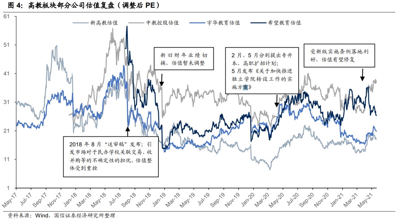 但至2021年4月时,国务院颁布了《中华人民共和国民办教育促进法实施条例》(以下简称《民促法》),该法案对民办高教外延并购并未提出限制,且维持对公开、公平、公允的关联交易的开放态度,专升本、高职扩招政策延续,且独立学院加速转设。这便意味着,前期影响高教、职教板块的政策不利因素全部消除,高教、职教两大赛道有望迎来估值修复。