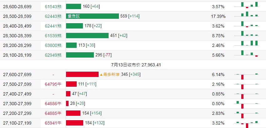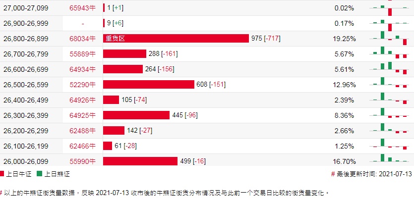 牛证街货重货区在26,800-26,899区间,该区间最新牛证数量为975张,较上一交易日减少717张;最多新增在27,600-27,699区间,该区间最新牛证数量为345张,较上一交易日增加345张。