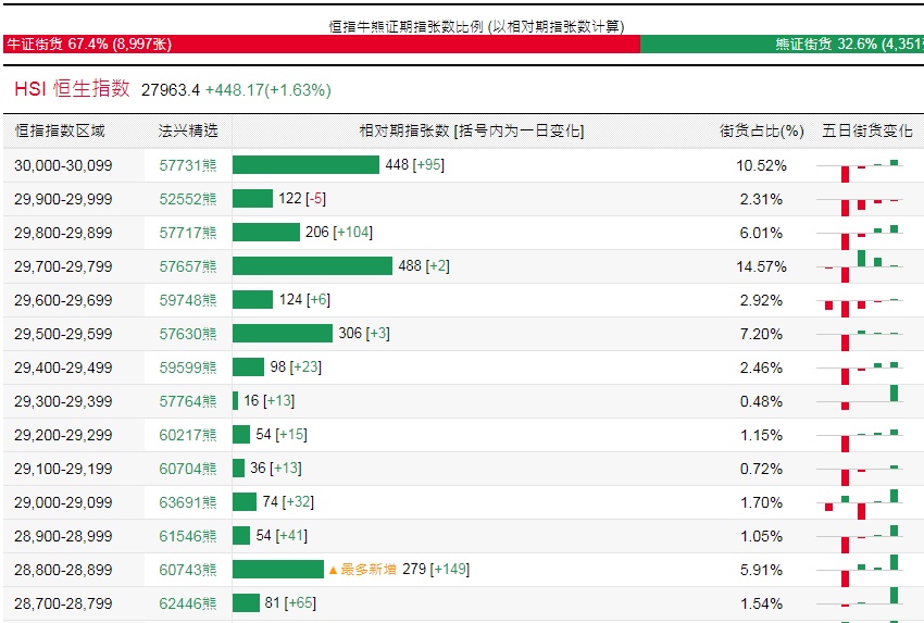 法兴恒指牛熊证街货分布图中的数据显示,熊证街货重货区在28,500-28,599区间,该区间最新熊证数量为559张,较上一交易日增加114张;最多新增在28,800-28,899区间,该区间最新熊证数量为279张,较上一交易日增加149张。