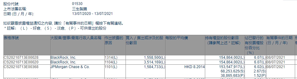 智通财经APP获悉,香港联交所最新资料显示,7月8日,小摩增持三生制药(01530)158.4733万股,每股作价8.2014港元,总金额约为1299.70万港元。增持后最新持股数目约为1.54亿股,最新持股比例为6.02%。